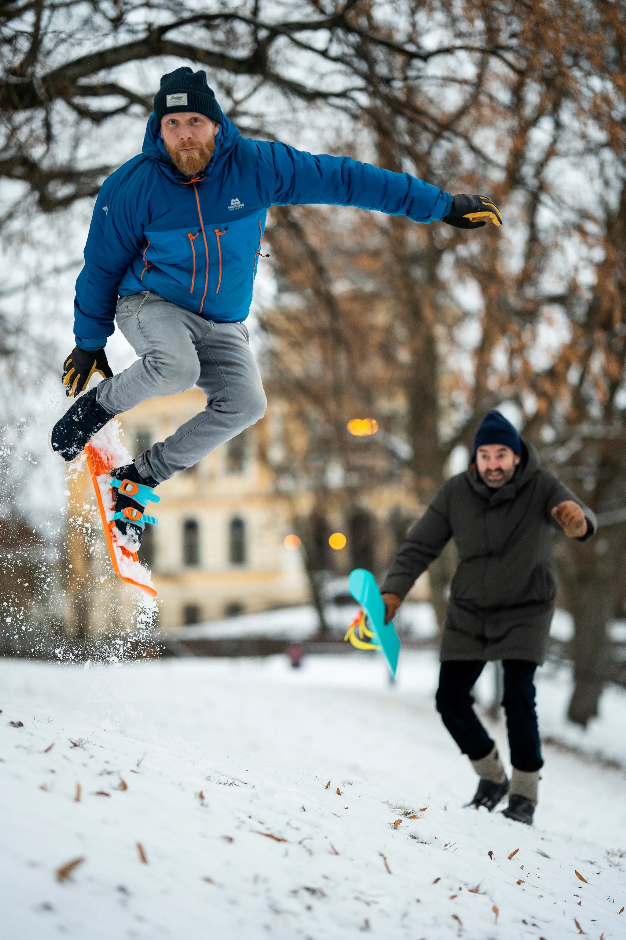 OneFoot Miniski festes rett på skoene dine – ingen bindinger, ingen ekstra utstyr. Stroppene justeres rundt vanlige vintersko, og så er du klar til å skli. De korte skiene gir god fart, kontroll og masse moro på både hard og myk snø.